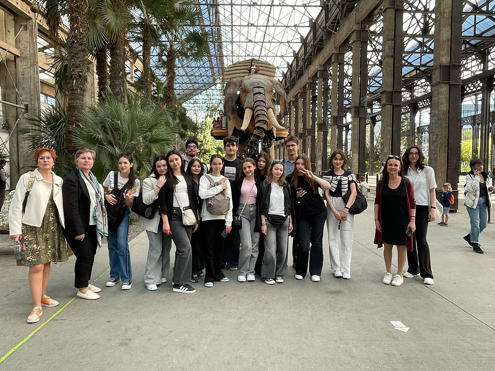 Joi marchează o zi tristă: proiectul se apropie cu pași repezi de un final pe care nimeni nu îl aștepta. Totuși, această melancolie pasageră nu ne-a putut împiedica din a avea o altă zi cât se poate de încărcată și de frumoasă, sub cerul senin atât de rar în Țara Loarei. Răcoarea revigorantă a dimineții ne-a întâmpinat ca întotdeauna când am pornit către tramvaiul ce avea să ne ducă la stația Belle-Beille Campus, pentru ca, mai apoi, să ne îndreptăm cu toții către primul nostru curs comun din această săptămână, poate chiar cel mai interesant: o incursiune în realitatea virtuală, în lumi diverse și necunoscute multora dintre noi până acum. Sub îndrumarea domnului profesor François Thomas, am avut cu toții ocazia să plecăm din sala de clasă în vila visurilor noastre, pe șantiere de construcție, într-un atelier auto în care am schimbat bateriile mașinilor electrice fără a ne murdări sau accidenta (o lecție esențială în pregătirea viitorilor mecanici auto pentru a ști cum să evite orice risc) sau chiar în spațiu! După prânzul traditional diversificat, sănătos, dar și deosebit de gustos de la cantină, tot tramvaiul ne-a adus înapoi, în locul de unde am plecat, însă aventura noastră nu a luat sfârșit. Ne-am îmbarcat în tren și spre frumosul Nantes cu noi! Am fost cu toții plăcut surprinși să îl revedem pe domnul profesor François și să îl avem drept ghid în mica noastra escapadă de pe valea Loarei. Am început cu ce ne aștepta cel mai aproape de gară, tăcut și răbdător de secole: Castelul Ducilor de Bretania, cu zidurile sale impunătoare, pe care le-am escaladat cu vitejie spre a admira orașul de sus. Tot ceea ce am zărit de aici urma să fie explorat îndeaproape. Frumoasele stăduțe vibrante și pline de terase animate din cartierul central Bouffay ne-au condus pașii, aproape pe nesimțite, către piață, unde am fost încântați de domnul profesor cu o scurtă, dar fascinantă lecție de istorie. Nici Piața Roială nu a fost mai prejos, dar ceea ce ne-a atras cu adevărat atenția a fost faimoasa braserie La Cigale din Piața Graslin care își încântă clienții deopotrivă cu delicii culinare și cu designul interior clasic lucrat cu măiestrie în lemn încă din 1895. Fără să-l fi avut și pe amabilul domn François în acest tur, faleza Loarei ne-ar fi ascuns secrete sumbre, dar valoaroase. Astfel, ne-am bucurat de o incursiune în vremea sclavagismului, când căpitanii de navă, sesizând oarece semn de împuținare a resurselor rămase, luau decizia barbară de a se descotorosi de femeile neputincioase sau chiar mai vrednice decât ei înșiși, doar pe seama unor dogme injuste.